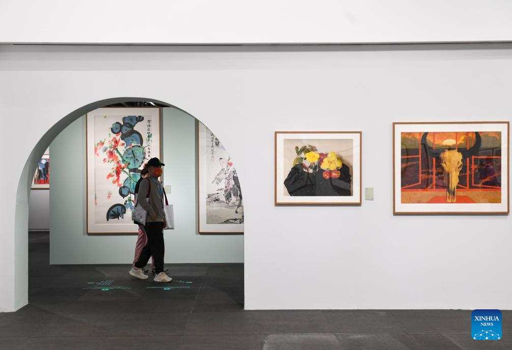 Visitors view paintings at a new venue of Shenzhen Art Museum in Shenzhen, south China's Guangdong Province, Nov. 6, 2023. The new venue of Shenzhen Art Museum opened on Monday with a series of exhibitions set to open to the public the next day. (Xinhua/Mao Siqian)