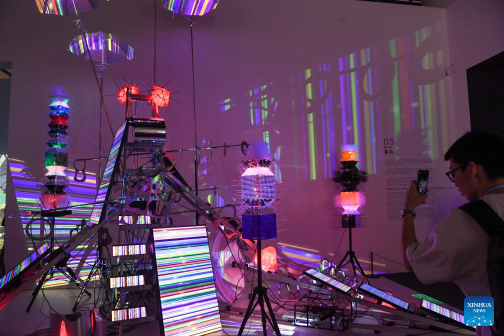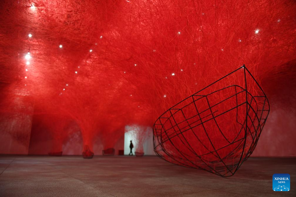 A staff member demonstrates installation art at a new venue of Shenzhen Art Museum in Shenzhen, south China's Guangdong Province, Nov. 6, 2023. The new venue of Shenzhen Art Museum opened on Monday with a series of exhibitions set to open to the public the next day. (Xinhua/Mao Siqian)