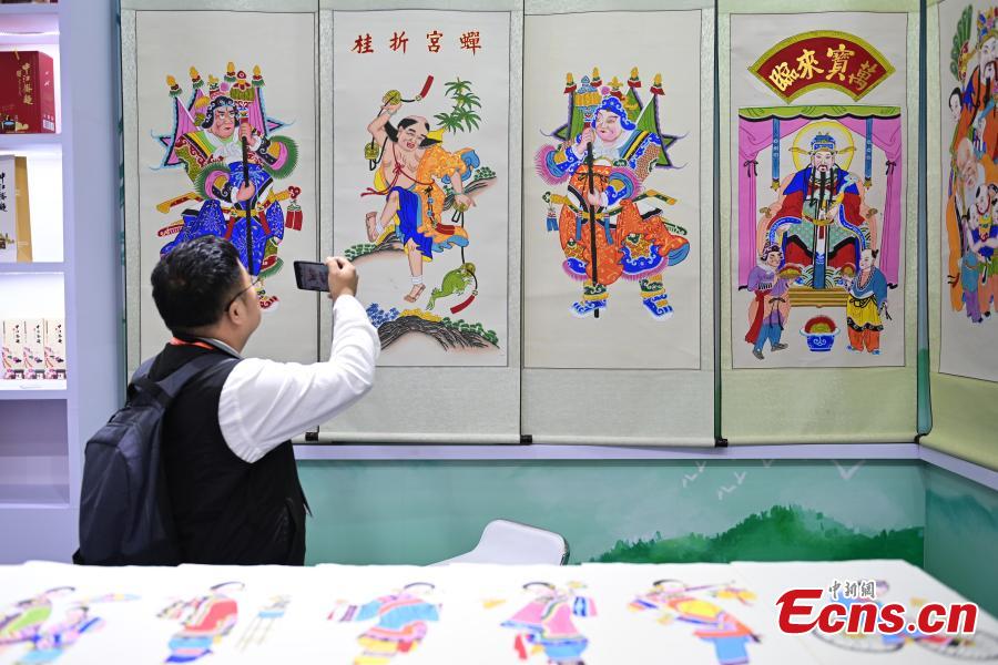 A visitor takes photos of Mianzhu wood engraving New Year paintings,or nianhua in Chinese, a representative project of national intangible cultural heritageat the 6th China International Import Expo (CIIE) in Shanghai, Nov. 7, 2023. (Photo: China News Service/Tian Yuhao)