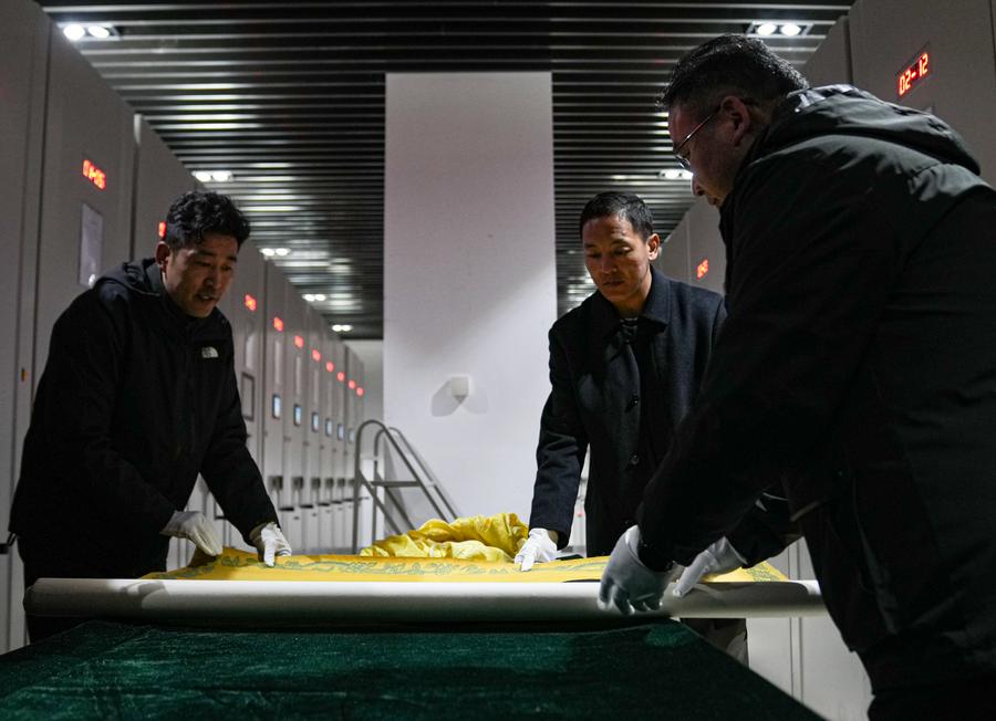 Staff members work at the Archives of Xizang Autonomous Region in Lhasa, southwest China's Xizang Autonomous Region, April 11, 2024. (Xinhua/Jigme Dorje)