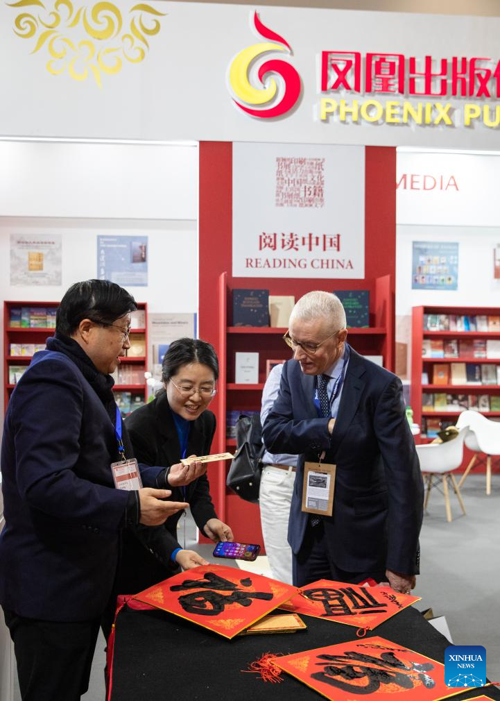 Visitors are pictured at the Chinese publishers' exhibition area at the 76th Frankfurt Book Fair in Frankfurt, Germany, Oct. 17, 2024. The Frankfurt Book Fair officially opened on Tuesday. Chinese publishers are making a significant impact at this year's fair, showcasing more than 3,500 books, including 1,500 in foreign languages. In addition to new book releases, Chinese publishers are holding numerous premieres and signing ceremonies for copyright agreements, with up to 1,000 books available for copyright trade. The fair will also feature a promotional event for the 2025 Beijing International Book Fair and a session on copyright trade between China and Europe. (Xinhua/Zhang Fan)