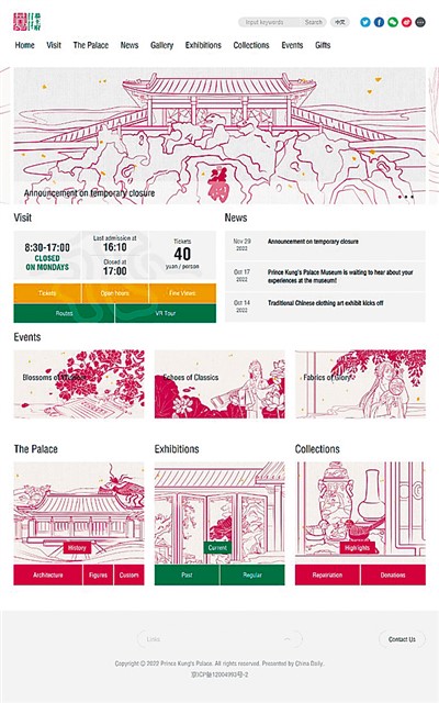 視覚設計の上で、恭王府博物館の新版英語サイトは恭王府博物館オリジナルの伝統絵畫線畫風の形式と王府の特色ある景観を融合させ、清代王府の伝統的な色彩の中の赤、緑の2色を主な色調とし、黃色、灰色を補助し、色調が清新で典雅で獨特で、中國の伝統的な建築の風姿が殘されていない。博物館の豊富な歴史文化資源に基づいて、ウェブサイトはガイド、動態、光影、展覧、所蔵品、活動と文創などの欄に分けられ、恭王府博物館の奧義と風貌を十分に展示し、國內外のユーザーに「クラウド」を通じて恭博、愛上恭博を理解させた。