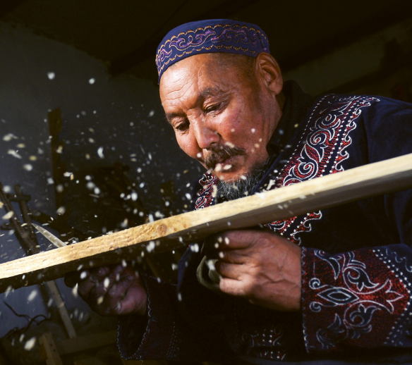 スランベックさんの工房の壁には、毛皮スキーを作るためのさまざまな道具が整然と掛けられ、ドアの脇に置かれた大きなバケツには馬の皮が浸され、ドアの左側の木の棚には、これまでに作られたさまざまな大きさの毛皮スキー板が並べられている?!杆饯胃袱洗蠊い?、私の初めての毛皮スキー板は、父がシロマツと馬と牛の皮で作ってくれたものでした。14歳から毛皮スキーの工蕓を父から教わりました。毛皮スキーの工蕓はわが家で5世代100年近く続いており、ご先祖さまが殘してくれた工蕓をなんとしてでもつないでいきたいです」と、スランベックさんは語る。彼の幼い頃の記憶では、毎年冬になると、祖父と父は皮の帽子、コート、ズボンを身に著け、さらに毛皮のスキーを履いて山を越え、狩りや薪集めをしていた。