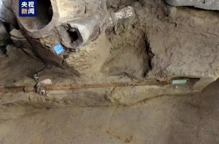 兵俑の殘骸の間に置かれている炭化した弓弩