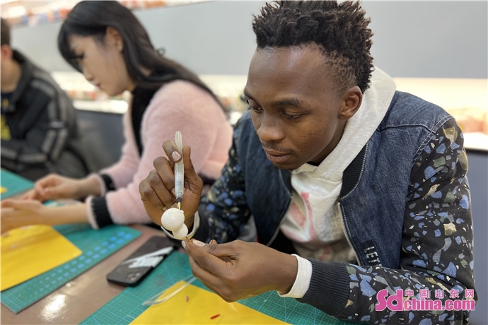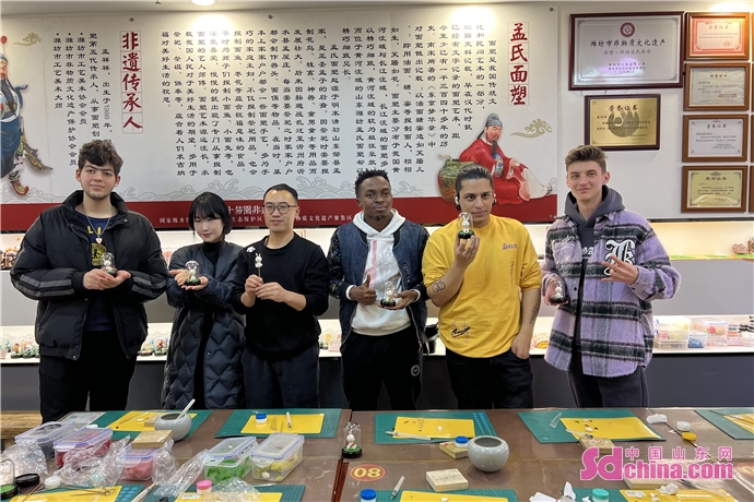 このほど、「「好客山東 好品山東『I love you』」留學生感知體験活動のメンバーはイ坊市十笏園無形文化スペースを訪れた。イ坊學院の留學生と外國人教員はここで凧、木版年畫、老貓花燈篭などのイ坊の代表的な無形文化プロジェクトを見學し、しん粉細工、皮彫りの製作を體験して、近い距離で指先の無形文化技術の魅力を感じた。