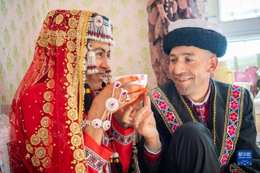 新疆ウイグル自治區塔県の県城付近に位置する富民村でお祝い事があった。古麗汗?賛加比力さん(25)と買熱買提汗?青鉄木爾さんが3年以上の交際を経て挙式した。結婚式は現地の民俗?伝統に基づくもので、賑やかで盛大だった。友人と村人が歌と踴りで共に祝った。