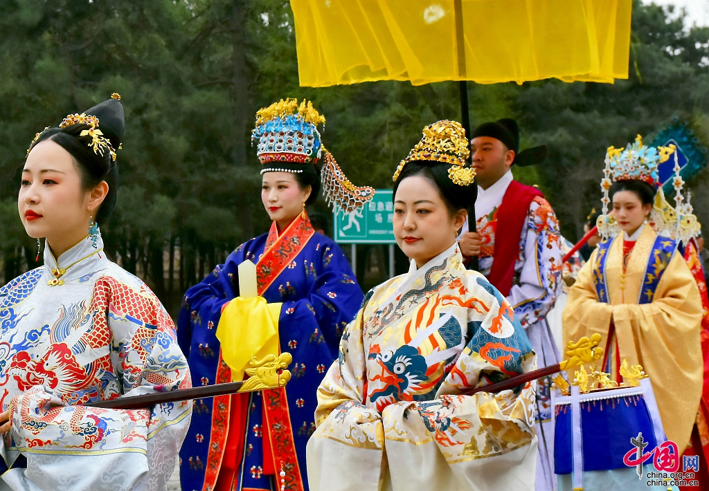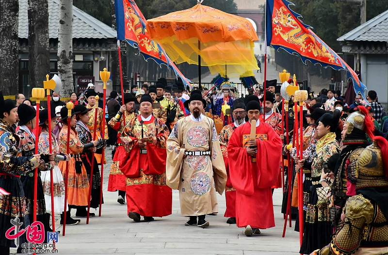 北京市昌平區の明十三陵神道風景名勝區で2日、第3回北京明文化祭りの「出警儀仗」行進が行われた?!赋鼍脎媷怼工蚊魍醭瘍x仗禮が再現された。