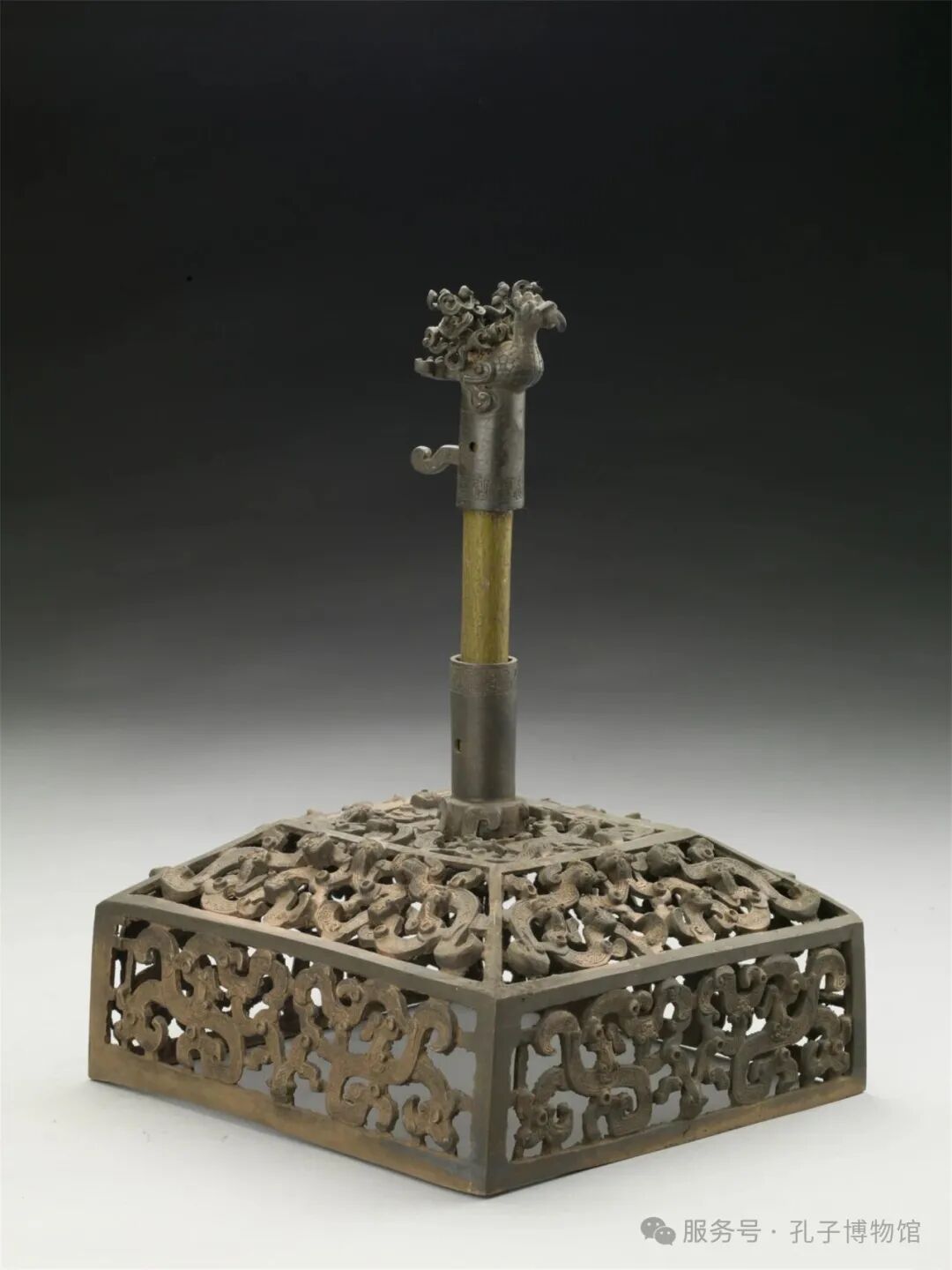 楚國在江漢地區稱霸數百年,盡管被中原各國斥為“蠻夷”,但在追尋周文化的過程中,創造了絲毫不遜色于周封列國的文物典章制度。在這一部分的展覽中,風格迥異于中原文化的楚國文物,成為當之無愧的亮色。信陽博物館藏的鳥形柱首與方器座,2005年出土于河南信陽長臺關9號墓,是楚文化的代表器物之一。這件器物造型獨特,柱首以鳥形雕琢而成,栩栩如生,盡顯古人對飛禽走獸的細致觀察與精湛的雕塑技藝;鏤空龍紋方座則以繁復精美的線條,訴說著龍作為古代神話生物與王權象征的深厚文化內涵。這件文物曾亮相上海博物館“河南夏商周三代文明展”,成為備受觀眾喜愛的“網紅”文物,此次再度展出,讓觀眾得以充分感受濃郁的楚文化魅力。