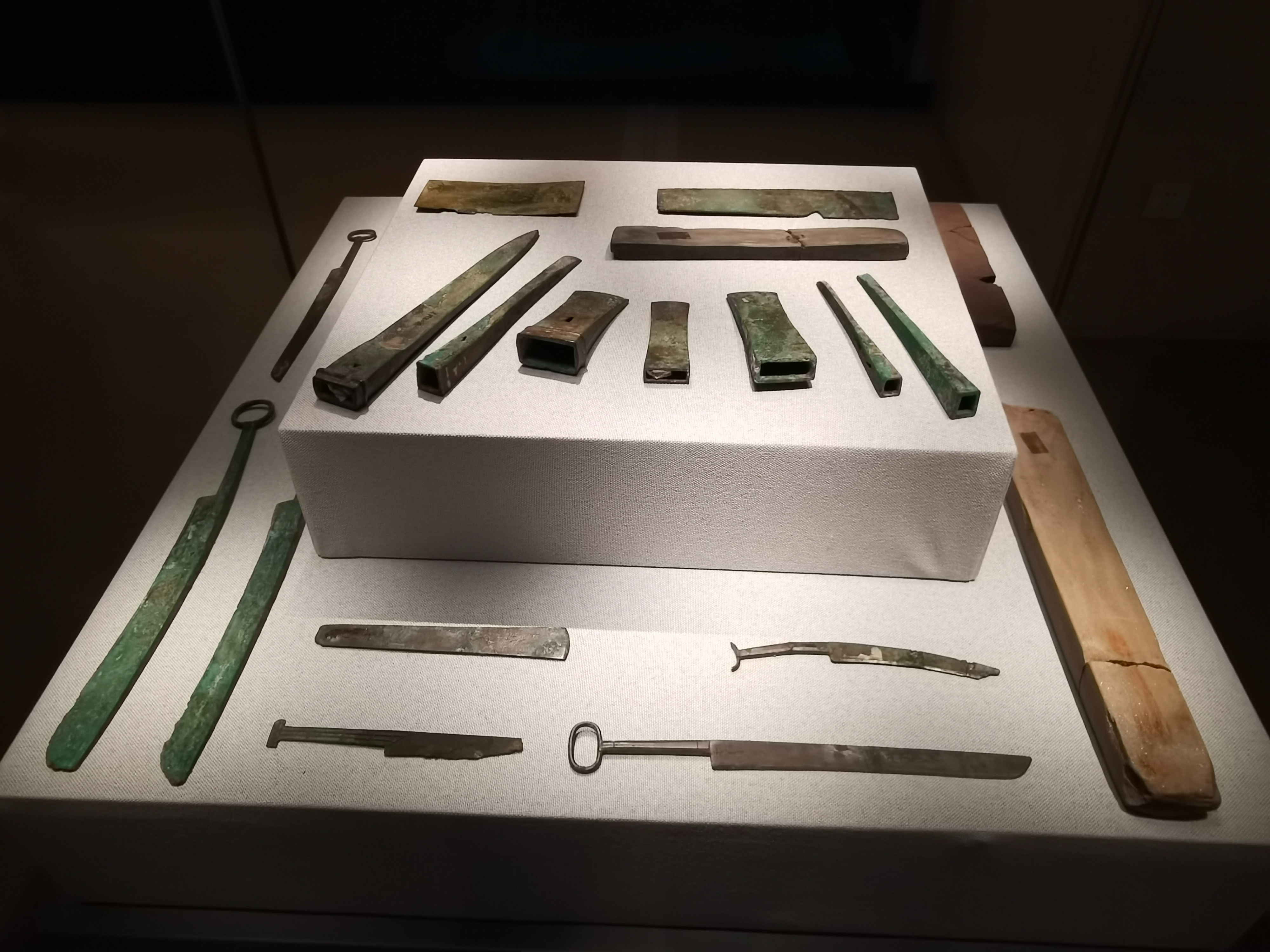 濟寧市博物館藏的一套春秋書刻工具,在這一展區亮相。這套工具于1978年在薛國故城被發現,據考證,墓主人是春秋時期的薛國國君。整套工具包括:青銅錛、鑿、斧、鋸,主要用于裁切、加工竹簡木牘;磨石用于竹簡木牘的表面打磨及利器的磨礪;青銅刀、削用于刻字、剔字,以及簡牘文字的細部加工;青銅針、鉆則用于竹簡的鉆孔?!斑@是目前全國唯一一套保存較為完整的春秋書刻工具,為研究春秋乃至西周晚期的書刻工具及其制作技術,提供了完備的實物資料,也讓觀眾得以直觀感受孔子整理文獻、刪述六經時所使用的工具風貌?!睗鷮幨胁┪镳^館長張超介紹。