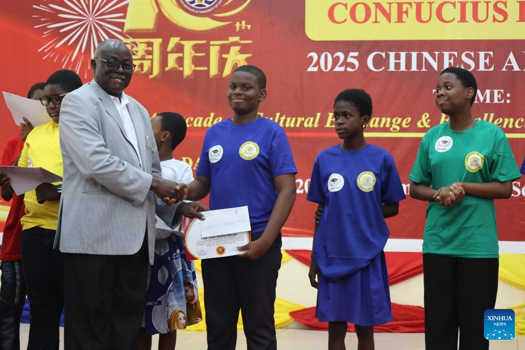 A student (3rd R) receives an award during a celebration marking the 10th anniversary of the Confucius Institute at the University of Cape Coast in Cape Coast, capital of Ghana's Central Region, Dec. 15, 2025. The Confucius Institute at the University of Cape Coast on Monday marked 10 years of Chinese language and culture education in the historical town of Cape Coast, capital of Ghana's Central Region. (Photo by Seth/Xinhua)
