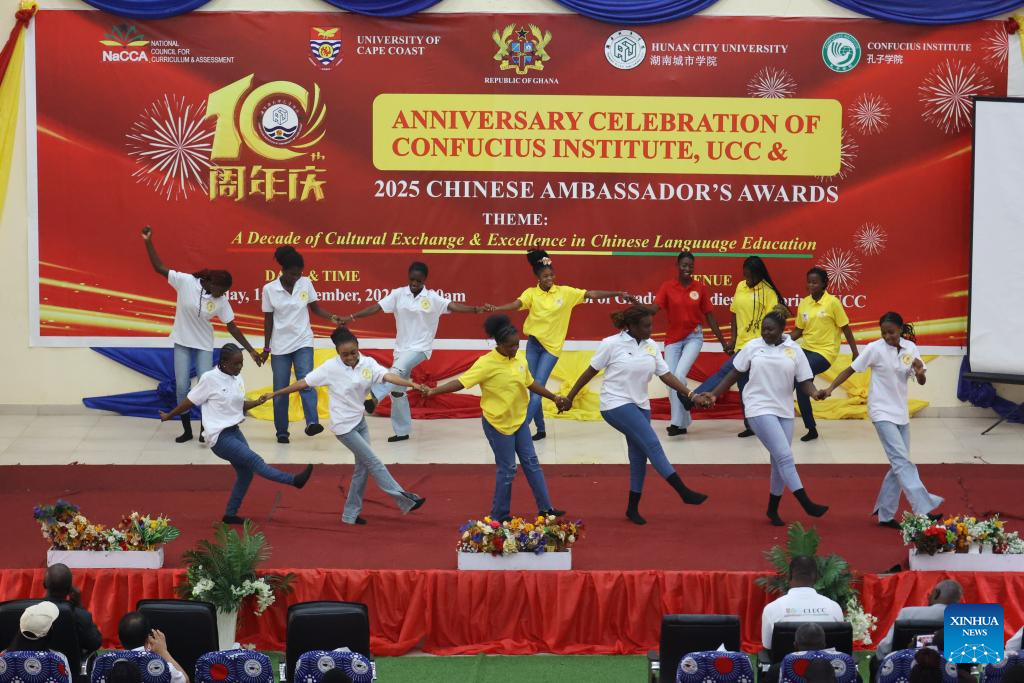 Students perform during a celebration marking the 10th anniversary of the Confucius Institute at the University of Cape Coast in Cape Coast, capital of Ghana's Central Region, Dec. 15, 2025. The Confucius Institute at the University of Cape Coast on Monday marked 10 years of Chinese language and culture education in the historical town of Cape Coast, capital of Ghana's Central Region. (Photo by Seth/Xinhua)