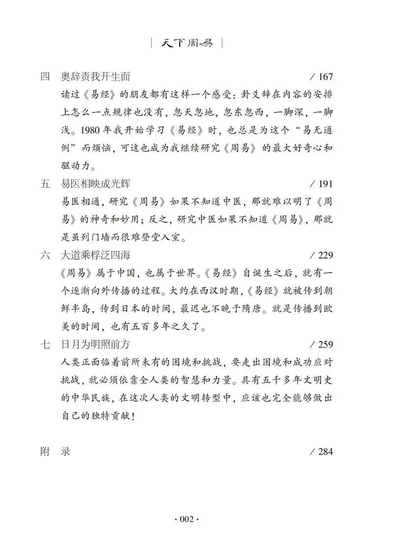 三、在面向未來的時間坐標軸上,作者視野宏闊,目光如炬,深刻闡述《周易》應對危機的獨特價值。作者認為《周易》實際上就是一門如何生存和發展的學問,是一部指導人們趨吉避兇、興利除害的寶典。面對人類社會進入21世紀后面臨的困境和挑戰,作者從借鑒《周易》智慧處理好人與自然、人與人、人與自身三種關系的角度予以積極樂觀應對,認為……提出的推動構建人類命運共同體理念,為人類迎接挑戰、走出危機貢獻了中國智慧和中國方案。