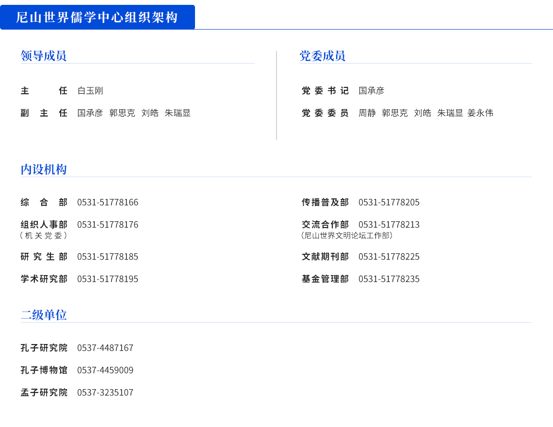 2020年10月,中國孔子基金會秘書處整建制并入尼山世界儒學中心,設立尼山世界儒學中心(中國孔子基金會秘書處),作為尼山世界儒學中心理事會和中國孔子基金會常設辦事機構,為省屬正廳級公益一類事業單位,掛中國孔子基金會秘書處牌子,歸口省委宣傳部管理。孔子研究院、孔子博物館、孟子研究院劃轉尼山世界儒學中心管理,實行省市共建、以省為主的管理模式。按照“一個中心、多個分中心、若干研究基地”的“1+N”模式,依托國內外知名院校和科研機構建設若干分中心和研究基地。