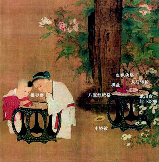 宋代的“嬰戲圖”是單獨一類繪畫題材,也畫出了豐富多彩的童年生活與形象各異的兒童玩具。最著名的“嬰戲圖”畫家,首推宋代蘇漢臣,其《秋庭戲嬰圖》中一對小姐弟正趴在圓墩上玩小游戲,這游戲叫“推棗磨”,玩具是自制的:一枚鮮棗削去半邊,露出棗核,用三根小木棍插在棗上,作三足立于桌上,棗核朝上;另用一根細竹篾,兩端各插一枚小棗,再將竹篾小心翼翼擱在棗核上,輕輕一推,便會旋轉不已。小姐弟身邊,還有一個圓墩,上面也堆放著幾個小玩具:人馬轉輪、八寶紋紙格、玳瑁盤、小陀螺、紅色佛塔、棋盒。地上還散落了一對小鐃鈸,活靈活現。