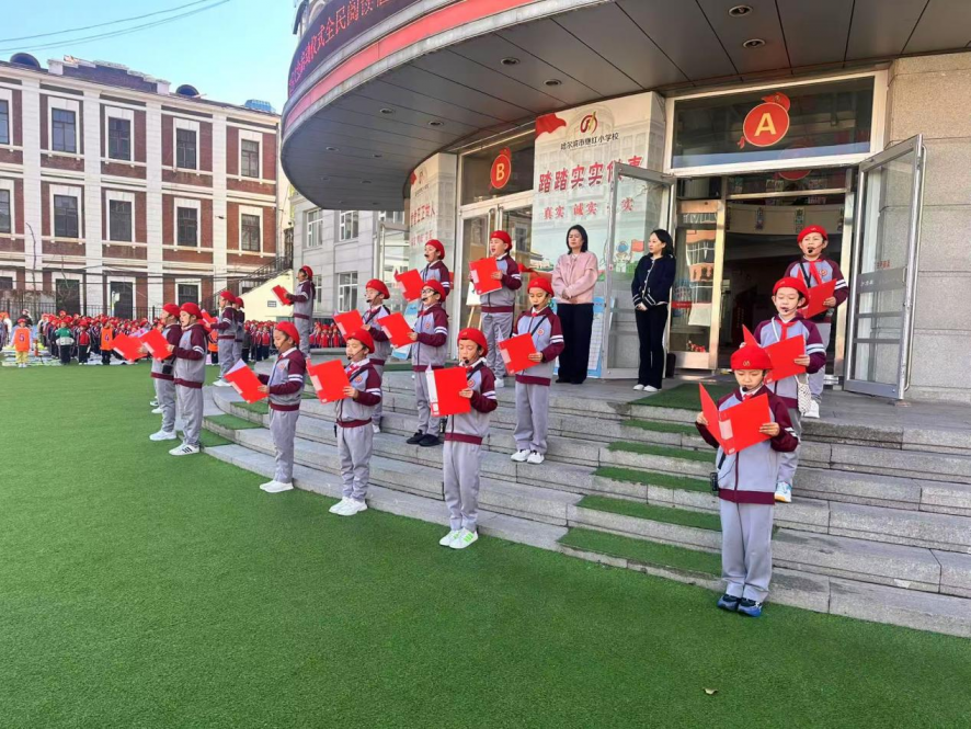 “還記得你上次讀書是什么時候嗎?”“通過親子誦讀《論語》,我們與先賢對話,感受他們的智慧與情懷,汲取前行的力量,讓生命的羽翼在思想的浸潤下愈發豐滿堅實。”五年級十班學生代表孫寧陽以稚嫩而堅定的聲音宣讀全民閱讀倡議書,一句 “放下手機讀讀本書”,道出了在數字化時代對深度閱讀的渴望。